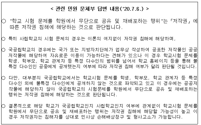 <head></head><body><div><b><font size="5">학원의 학교 시험문제 이용에 대한 저작권 유의사항 안내</font></b></div><div><br></div><div>평소 광주교육 발전을 위하여 노력해 주신 것에 대하여 감사드립니다.</div><div><br></div>학교 시험문제를 학원 등 에서 <b>무단으로 공유 및 재배포</b>하거나, <b>영리 목적으로 이용하는 행위</b>는 <b>저작권 침해로 민사상 손해배상 및 형사고소</b>가 가능함을 안내하오니<div><br></div><div>학원, 교습소 및 개인과외교습자께서는 위와 같은 사항을 잘 지키어서</div><div>불이익을 당하는 일이 없도록 운영에 적정을 기하여 주시길 바랍니다.</div>
